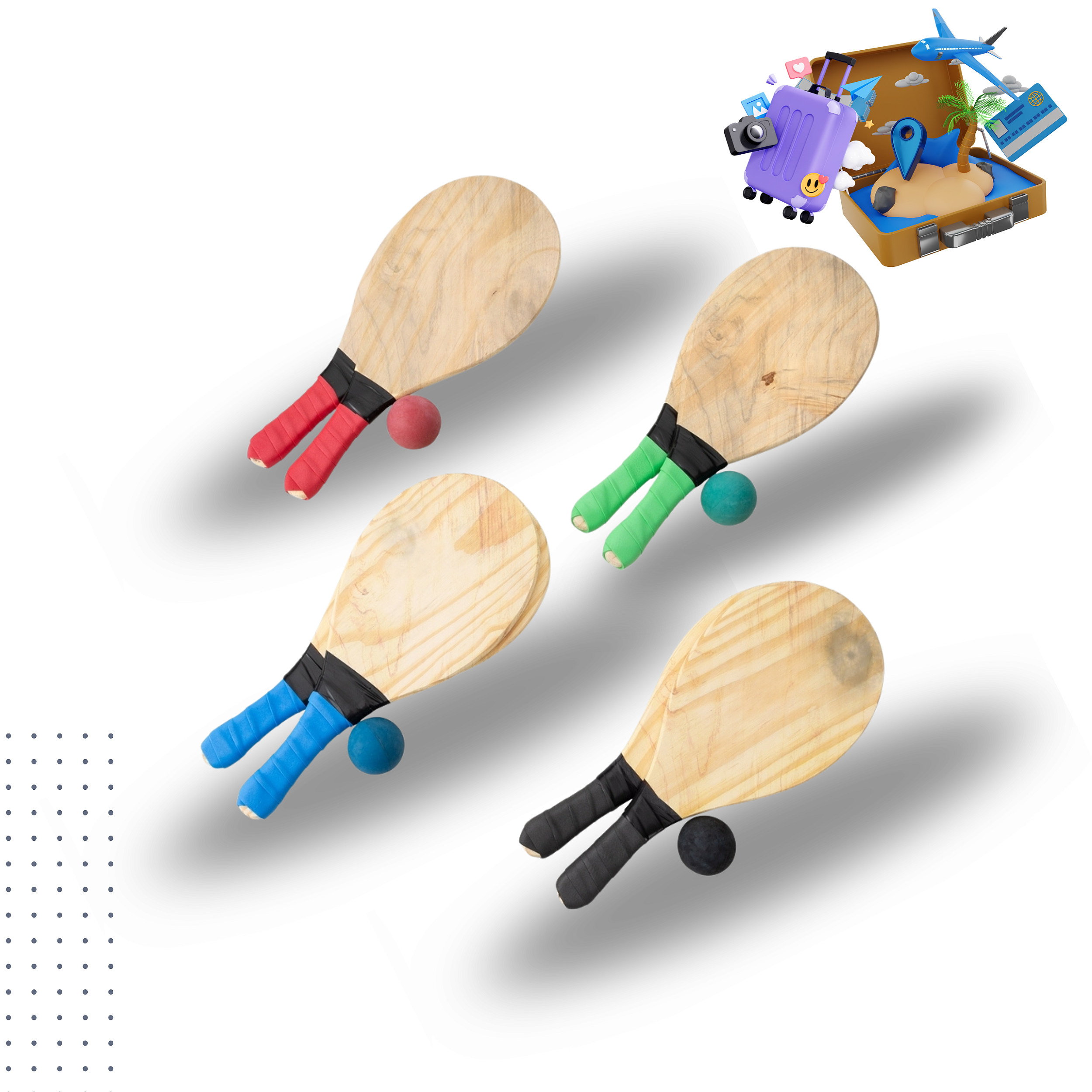 Descrição: Kit frescobol com embalagem de malha plástica. Contém 2 raquetes de madeira com pegador de revestimento EVA e bolinha emborrachada.