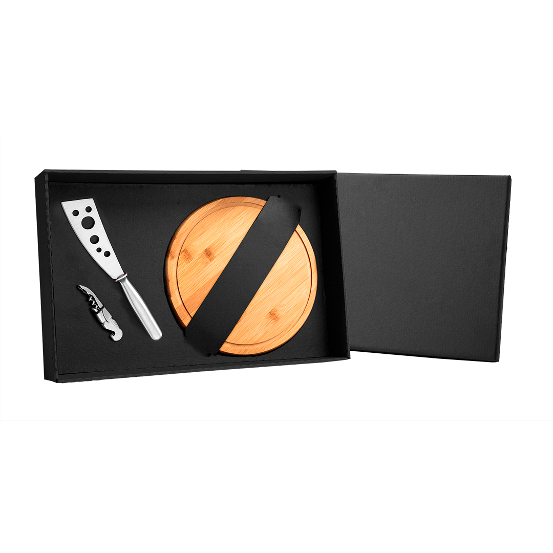 Kit para queijo e vinho. Conta com tábua para queijo/petiscos, faca para queijo em aço Inox 5 polegadas com 6 furos circulares e abridor saca-rolhas em aço inox escovado.